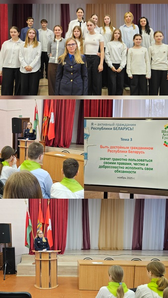 27 ноября 2025 года состоялась встреча учащихся со старшим следователем Жодинского ГОСК Чайковской Дарьей Дмитриевной. Тема мероприятия: «Быть достойным гражданином Республики Беларусь – значит грамотно пользоваться своими правами, честно и добросовестно исполнять свои обязанности».