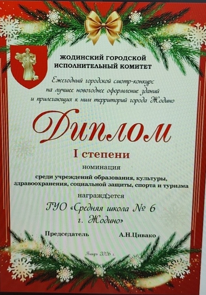 На заседании искполкома были подведены итоги и объявлены победители смотра-конкурса на лучшее новогоднее оформление по нескольким номинациям. В номинации среди учреждений образования, культуры, здравоохранения, социальной защиты, спорта и туризма ГУО "Средняя школа № 6 г. Жодино" награждена дипломом I степени